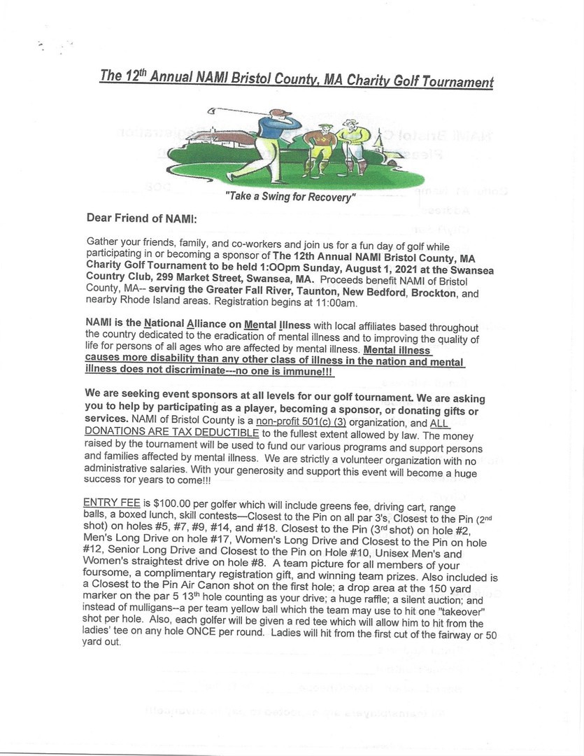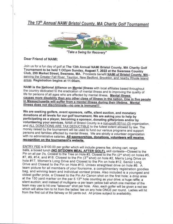 Gather your friends, family, and your co-workers and join us for a fun day of golf while participating in or becoming a sponsor of The 8th Annual NAMI of Bristol County Charity Golf Tournament to be held 1:00 PM Sunday, August 6,2017at the Swansea Country Club, 299 Market Street, Swansea, MA
