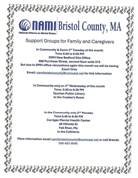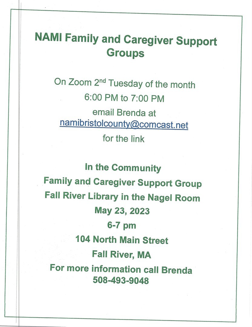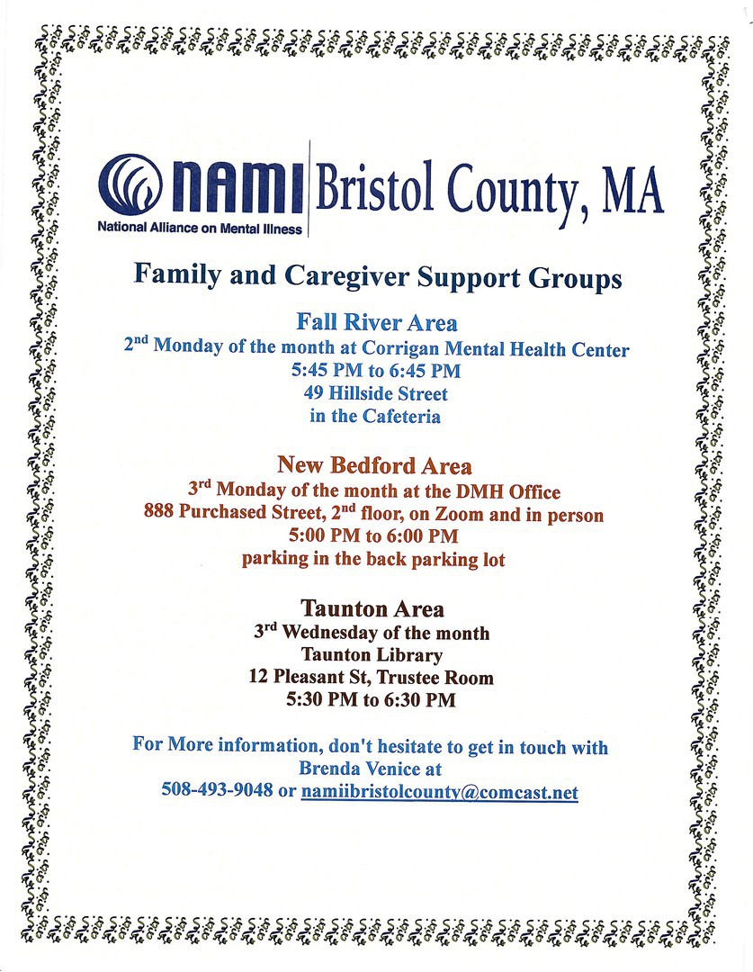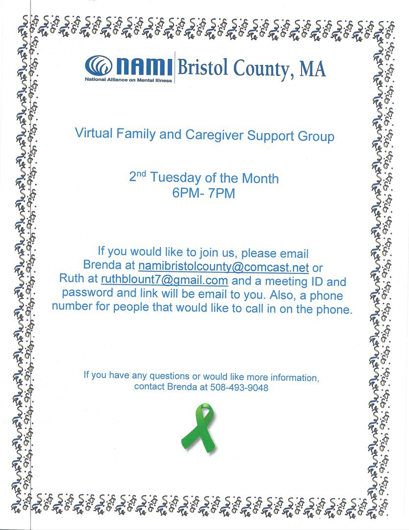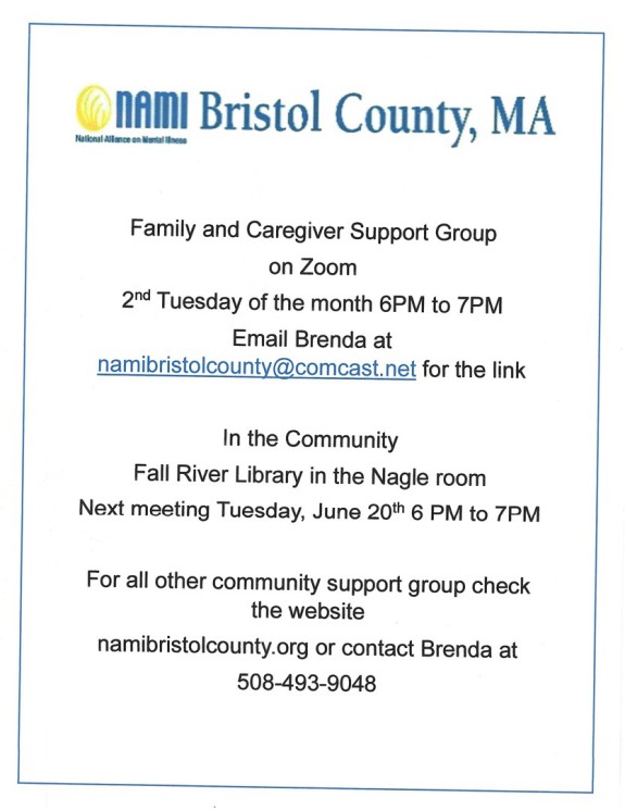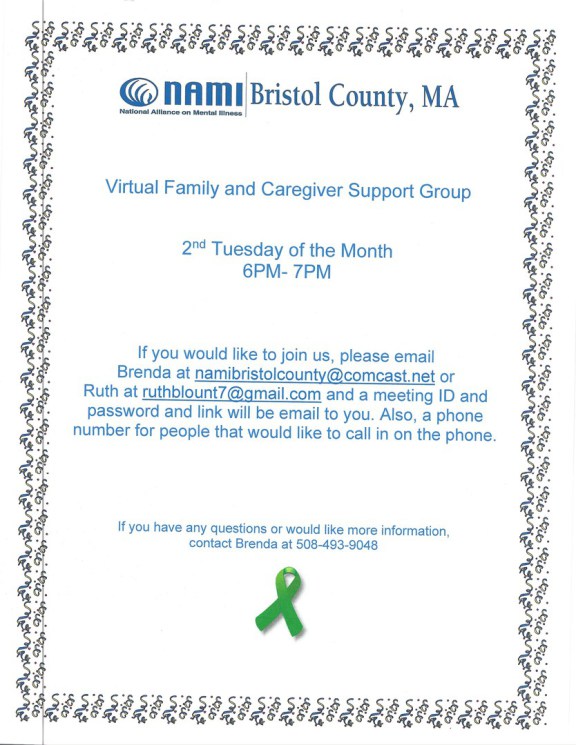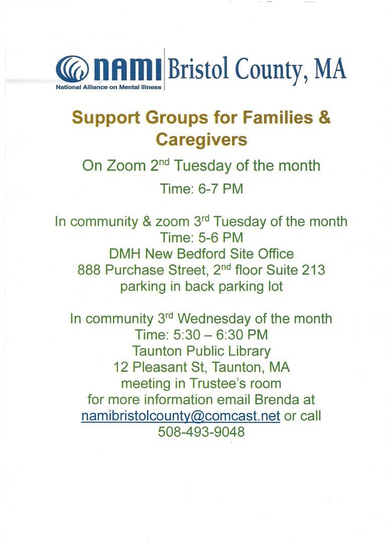 NAMI Family and Caregiver Support Group in New Bedford is on Zoon only for this month.